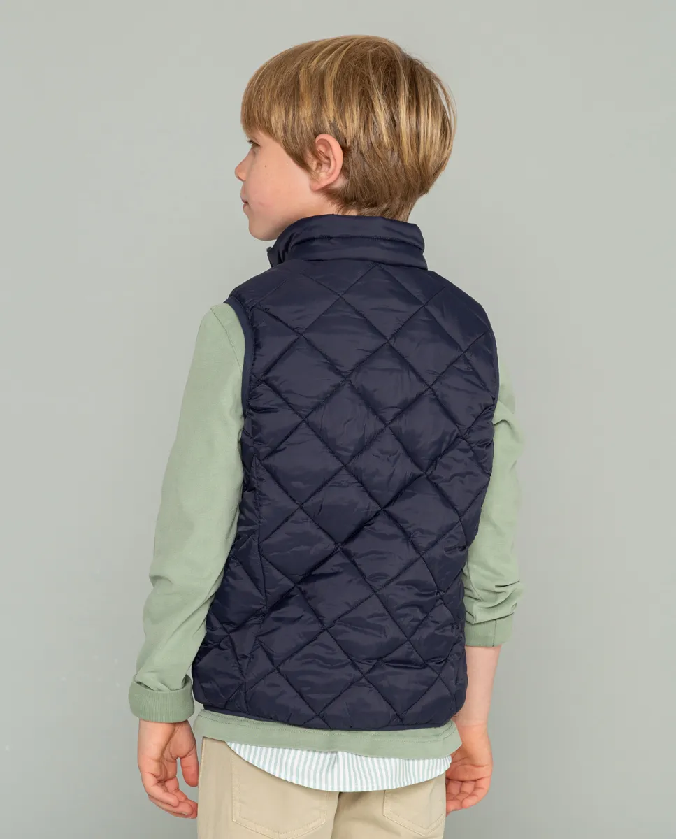 Chaleco de niño azul marino acolchado de corte slim fit, confeccionado en tejido de nylon con acabado water repellent, ideal para proteger del viento y la humedad ligera.