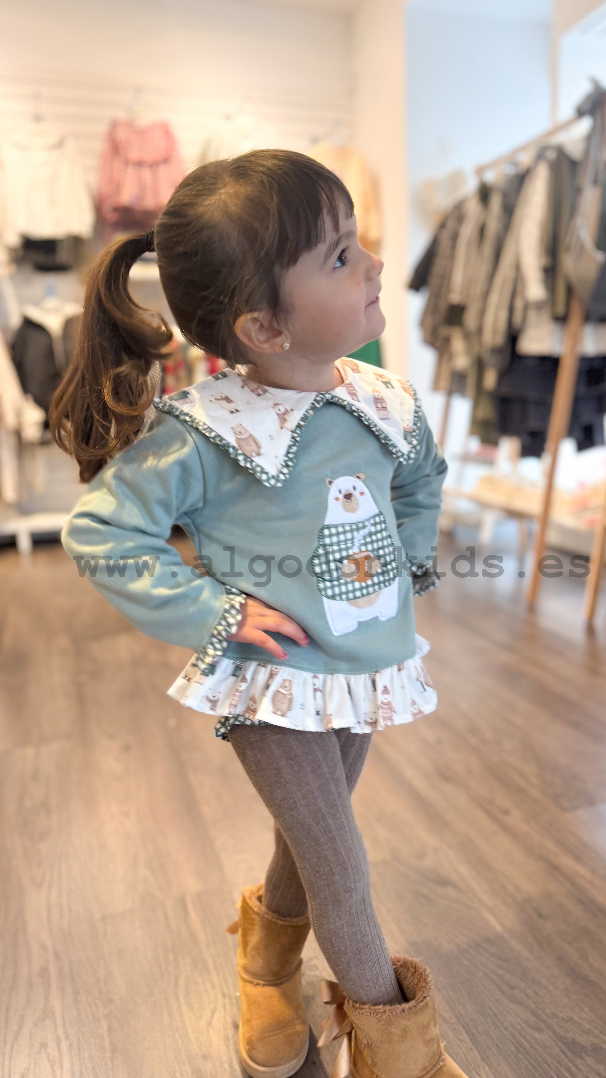 Conjunto de sudadera y braguita en tono verde, diseñado para mantener a tu pequeña cómoda y abrigada durante los días fríos. La sudadera ofrece ese toque coqueto que las niñas adoran, mientras que la braguita a juego completa un look perfecto para jugar, pasear o disfrutar de cualquier plan invernal. Tejido suave y acogedor que permite libertad de movimiento. Ideal para crear outfits versátiles que funcionan tanto en casa como en la calle.